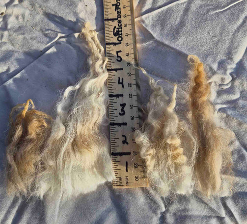 This nice, variegated Navajo-Churro hogget (lambs fleece), has white and tan fibers. The staple length is 3-6 inches. Weight is 1.0 pounds. It has been skirted however you may still find small amount of vegetal matter. Actual color may be brighter after washing. Domestic shipping included in the price. Qualifies for the Livestock Conservancy’s Shave’em to Save’em program.
